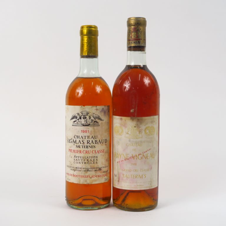 2 BOUTEILLES 1er CC SAUTERNES : 1 CHÂTEAU RAYNE VIGNEAU 1970 BG - 1 CHÂTEAU SIGALAS RABAUD 1981 HEP