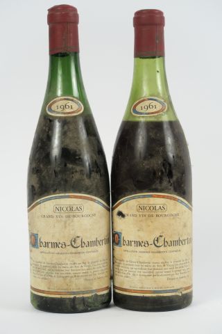 Lot de 2 BOUTEILLES CHARMES CHAMBERTIN NICOLAS - 1961 - 6 CM/6,5 CM/ELA au prix de 120 à 150 € en vente aux enchères par l'hôtel des ventes Primardeco