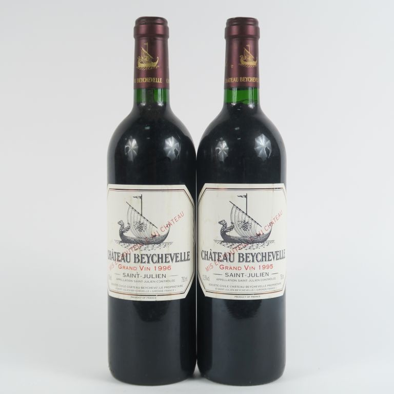 Lot de 2 BOUTEILLES CHÂTEAU BEYCHEVELLE GCC ST JULIEN : 1 de 1995 - 1 de 1996 au prix de 70 à 80 € en vente aux enchères par l'hôtel des ventes Primardeco
