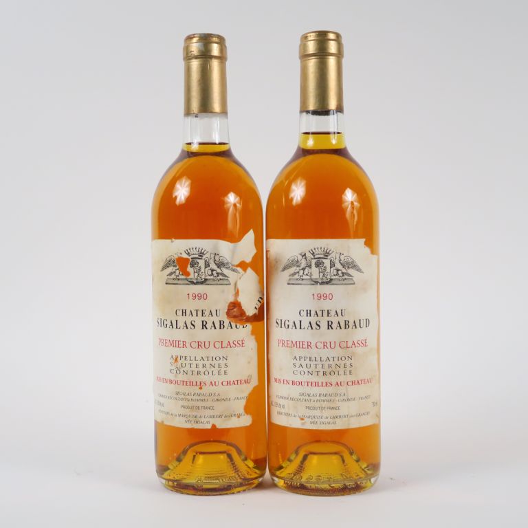 Lot de 2 BOUTEILLES CHÂTEAU SIGALAS RABAUD 1er CC SAUTERNES - 1990 - BG/ELA au prix de 80 à 90 € en vente aux enchères par l'hôtel des ventes Primardeco