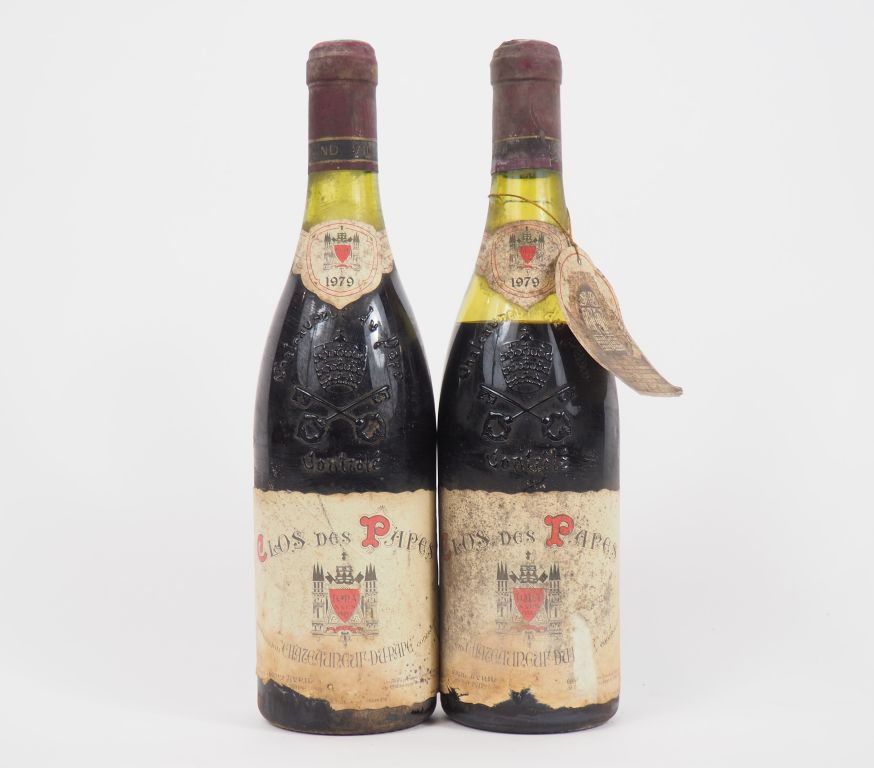 2 BOUTEILLES CHÂTEAUNEUF DU PAPE CLOS DES PAPES PAUL AVRIL - 1979 - 1 à 3 CM/1 à 7 CM/ETA