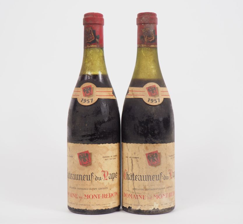 2 BOUTEILLES CHÂTEAUNEUF DU PAPE DOMAINE DE MONT REDON - 1957 - 1 à 4,5 CM CAPS ABIMÉE ELA/1 à 4 CM