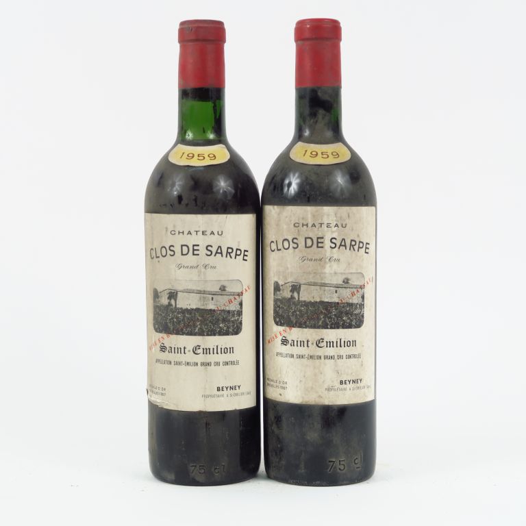 Lot de 2 BOUTEILLES CLOS DE SARPE ST EMILION - 1959 - BG/1 CAPS LEGER CORRODE au prix de 120 à 140 € en vente aux enchères par l'hôtel des ventes Primardeco