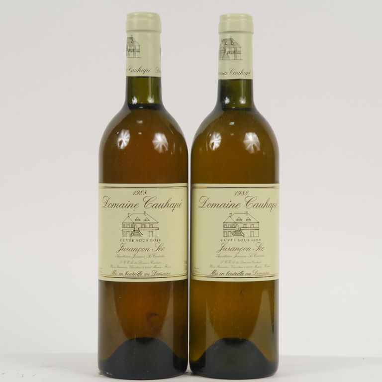 Lot de 2 BOUTEILLES DOMAINE CAUHAPÉ 'CUVÉE SOUS BOIS' JURANCON SEC - 1988 au prix de 10 à 15 € en vente aux enchères par l'hôtel des ventes Primardeco