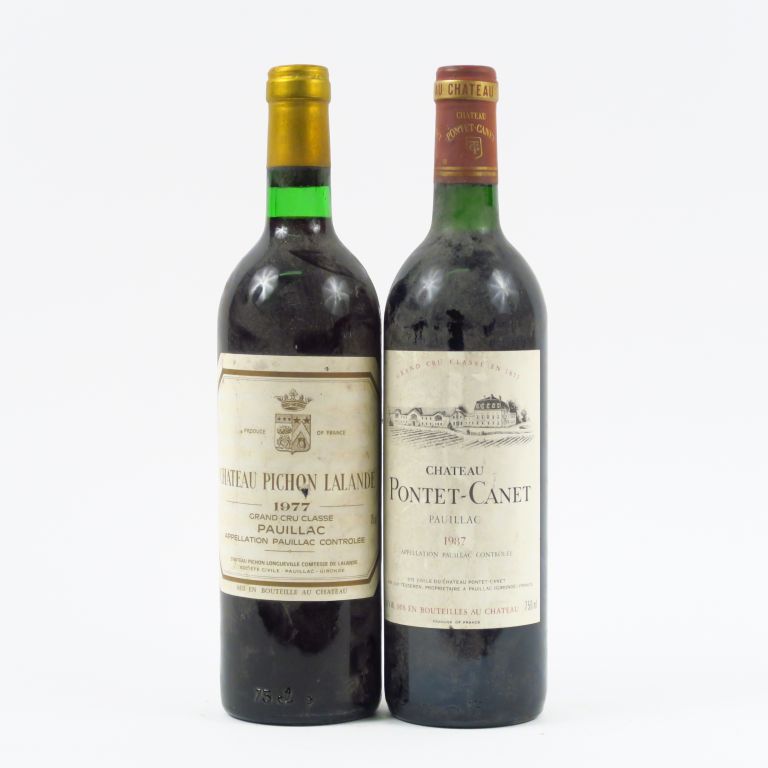 2 BOUTEILLES GCC PAUILLAC : 1 CHÂTEAU PICHON COMTESSE DE LALANDE 1977 - 1 CHÂTEAU PONTET CANET 1987 BG