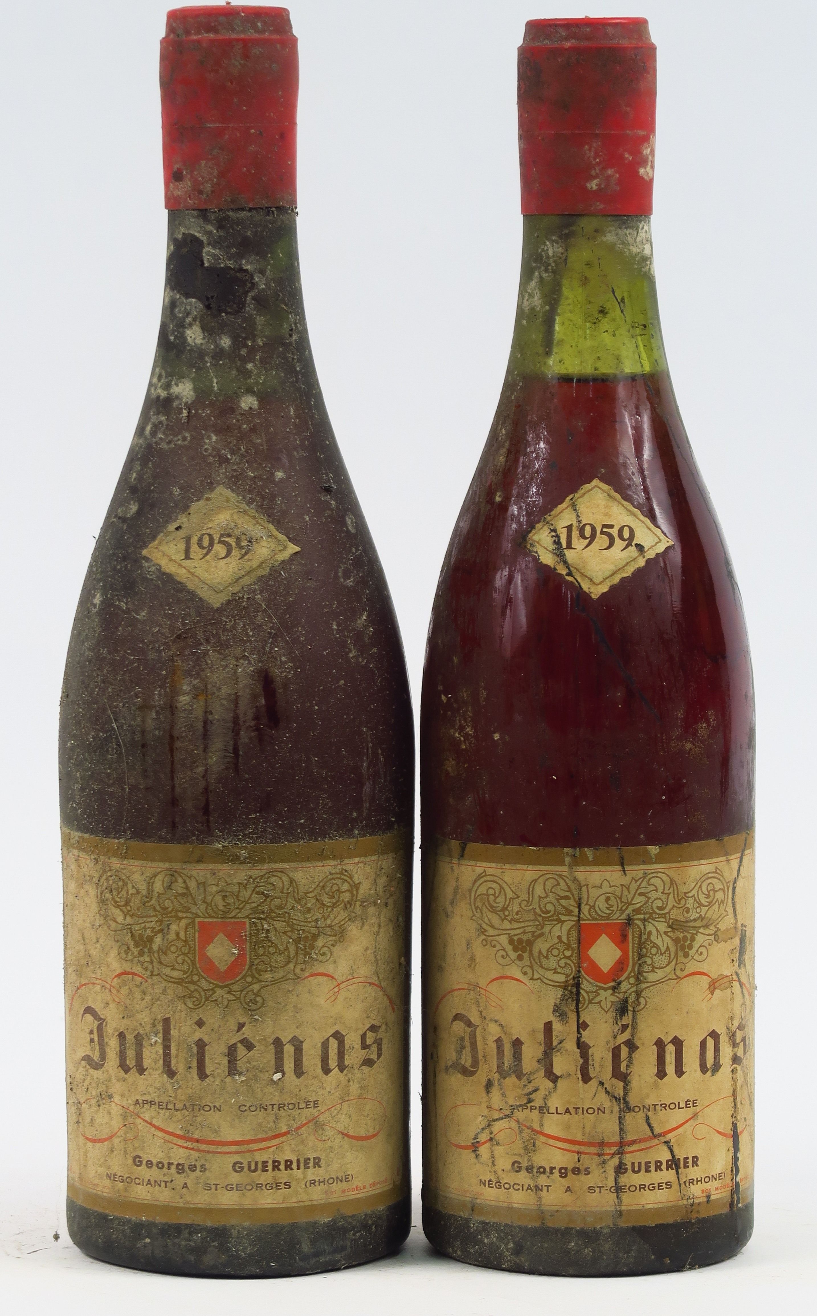 Lot de 2 BOUTEILLES JULIENAS G. GUERRIER - 1959 - 3 CM/4 CM/BS/ELA au prix de 10 à 15 € en vente aux enchères par l'hôtel des ventes Primardeco