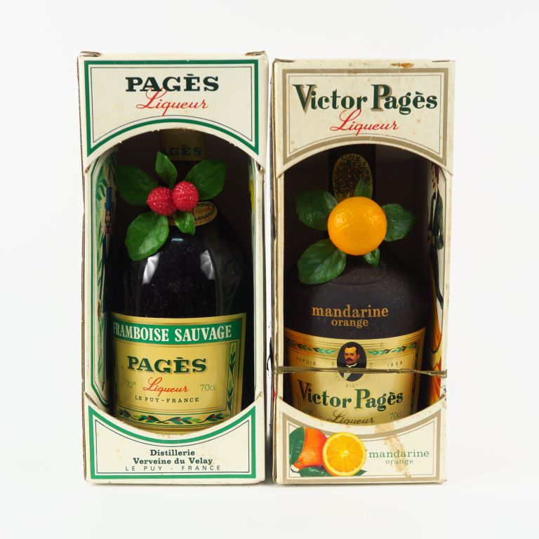 2 BOUTEILLES LIQUEUR PAGES : 1 FRAMBOISE SAUVAGE - 1 MANDARINE ORANGE - COFFRETS