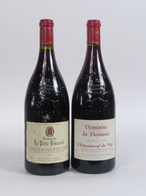 2 MAGNUMS CHÂTEAUNEUF DU PAPE : 1 DOMAINE LA PETITE BISCARELLE 1997 1 CM - 1 DOMAINE DE LA DESTINEE P. FOLLIET 1998 0,5 CM