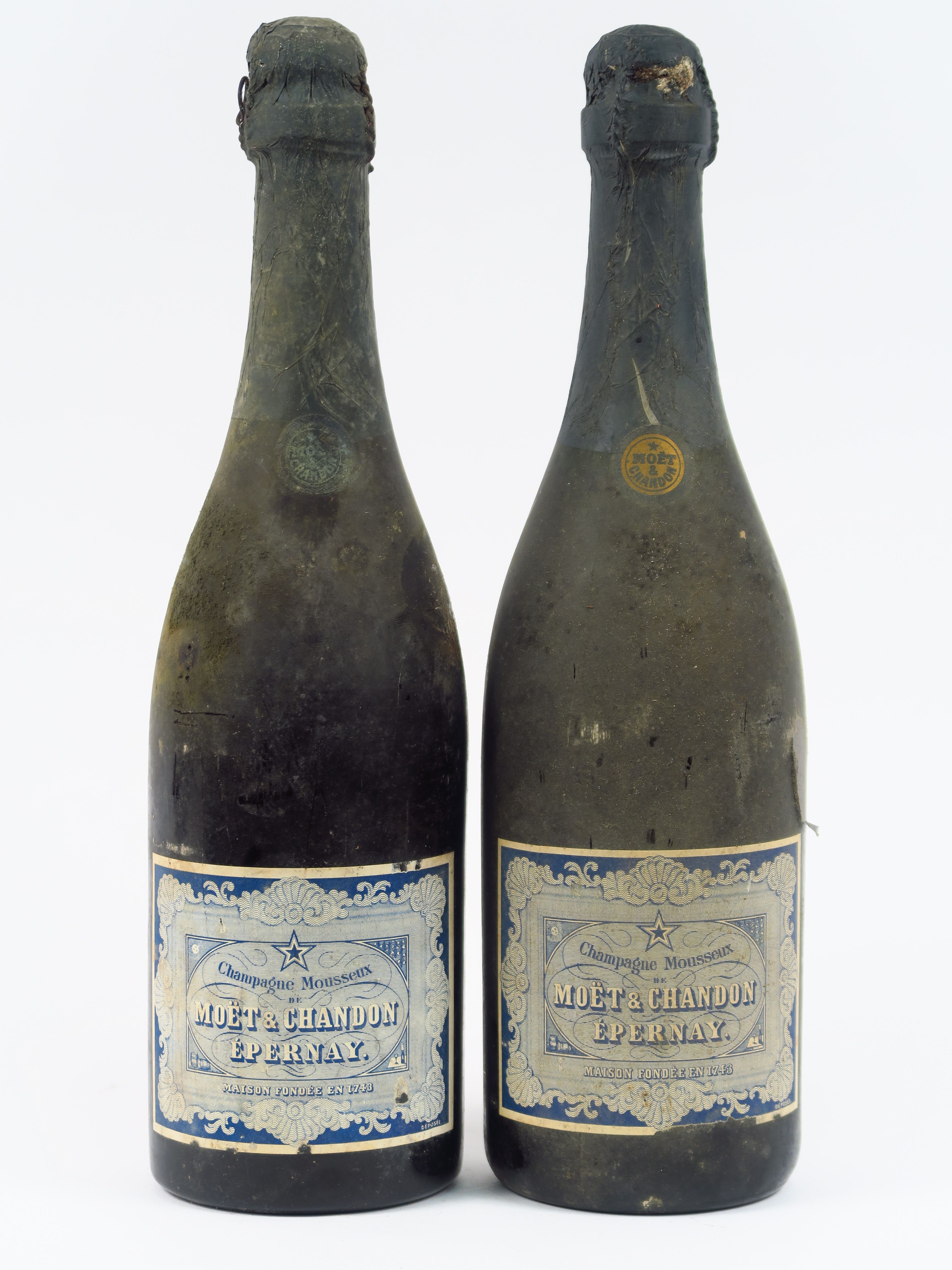 2 TRES VIEILLES BOUTEILLES CHAMPAGNE MOUSSEUX MOET CHANDON - 2 CM ET 1 CM SOUS LA COIFFE/BS/ETLA/ 1 CAPS L ABIMEE/1 CAPS LEGER CORODEE