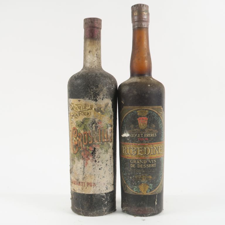 2 VIEILLES BOUTEILLES : 1 SIROP DE GROSEILLE BS/EA - 1 RIBEDINE VIOLET FRERES BS