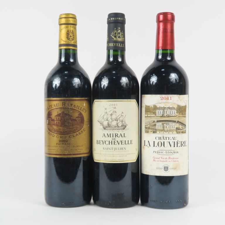 3 BOUTEILLES : 1 CHÂTEAU BATAILLEY GCC PAUILLAC 2002 - 1 CHÂTEAU LA LOUVIERE GRAVES 2011 - 1 AMIRAL DE BEYCHEVELLE ST JULIEN 2001