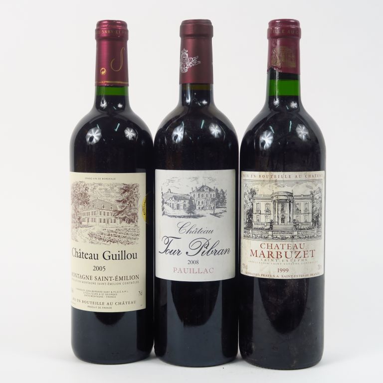 3 BOUTEILLES : 1 CHÂTEAU GUILLOU MONTAGNE ST EMILION 2005 - 1 CHÂTEAU TOUR PIBRAN PAUILLAC 2008 - 1 CHÂTEAU MARBUZET ST ESTEPHE 1999