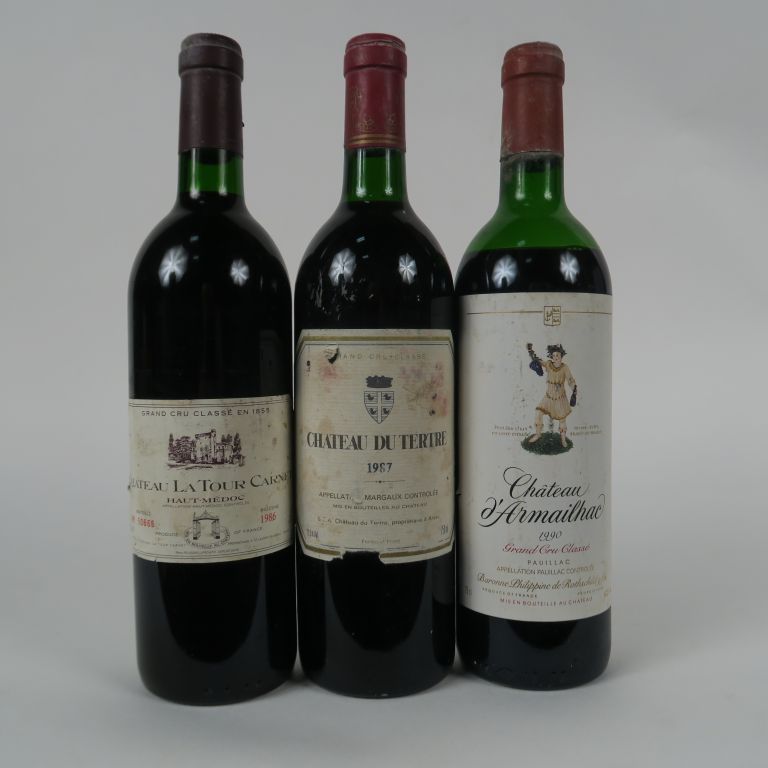 3 BOUTEILLES : 1 CHÂTEAU LA TOUR CARNET HAUT-MEDOC 1986 ELT - 1 CHÂTEAU DU TERTRE GCC MARGAUX 1987 BG/ETLT/ETLA - 1 CHÂTEAU D'ARMAILHAC GCC PAUILLAC 1990 BEP/ETLA
