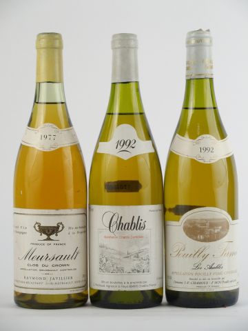 3 BOUTEILLES : 1 MEURSAULT 'CLOS DU CROMIN' R. JAVILLIER 1977 - 1 CHABLIS PERCHAUD 1992 - 1 POUILLY FUME 'LES ARABLES' CHAMOUX 1992