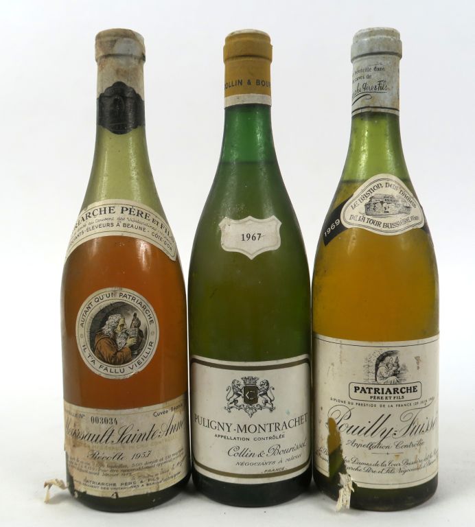 3 BOUTEILLES : 1 MEURSAULT SAINTE-ANNE PATRIARCHE PÈRE ET FILS 1957 6,5 CM/ETLA/BS - 1 PULIGNY MONTRACHET COLIN BOURISSET 1967 3 CM - 1 POUILLY FUISSE LE BASTION DES DAMES DE LA TOUR BUSSIERE PATRIARCHE PÈRE FILS 1969 4 CM/ETA