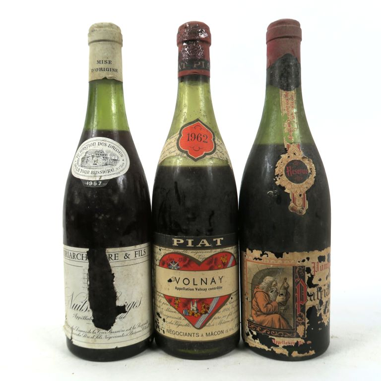 3 BOUTEILLES : 1 NUITS SAINT GEORGES LE BASTION DES DAMES DE LA TOUR BUSSIERE PATRIARCHE PÈRE FILS 1957 4,5 CM/ETA - 1 VOLNAY PIAT 1962 8 CM/ELA/BS - 1 VIELLE BOUTEILLE POMMARD PATRIARCHE PÈRE FILS 5,5 CM/ETA/BS