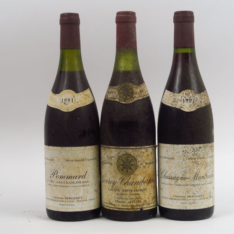 3 BOUTEILLES : 1 POMMARD 1er CRU 'LES CHANLINS BAS' C. BERGERET 1991 - 1 CHASSAGNE MONTRACHET C. BERGERET 1991 - 1 GEVREY CHAMBERTIN 'LAVAUX ST JACQUES' C. ASTLEY 1977