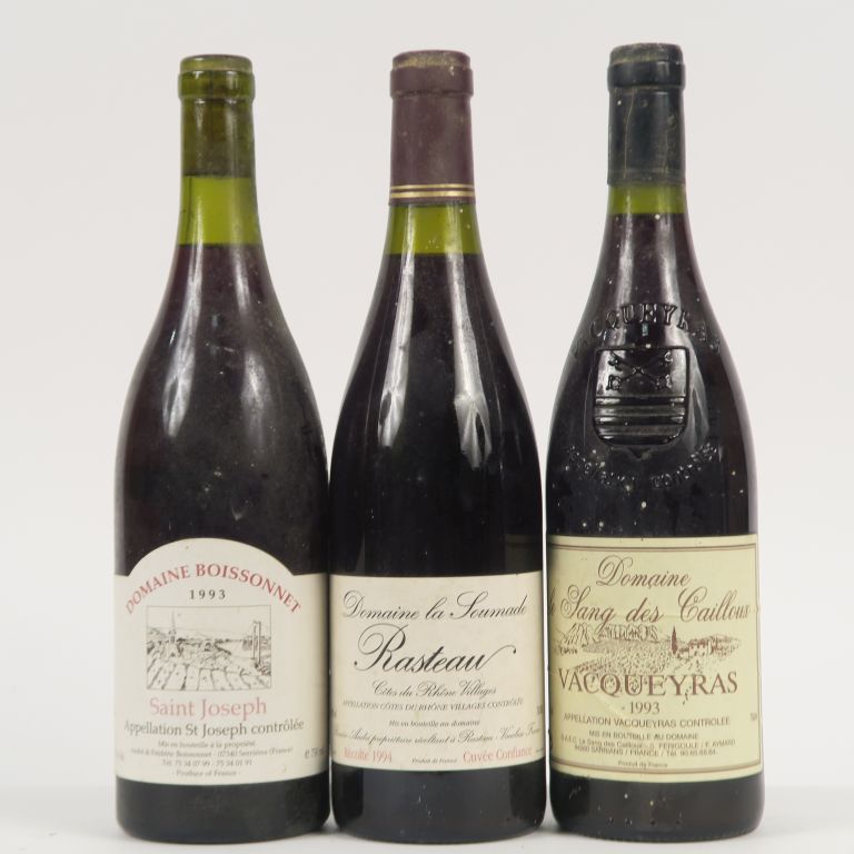 3 BOUTEILLES : 1 RASTEAU DOMAINE LA SOUMADE 1994 - 1 VACQUEYRAS DOMAINE LE SANG DES CAILLOUX 1993 - 1 SAINT JOSEPH DOMAINE BOISSONNET 1993
