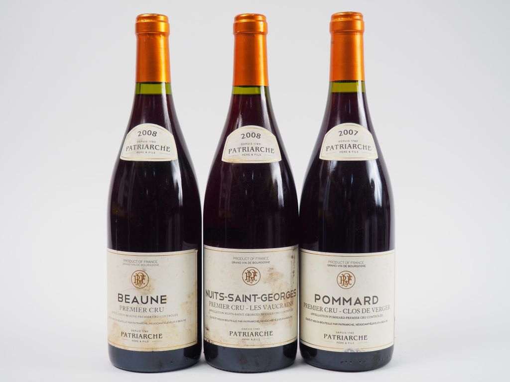 3 BOUTEILLES BOURGOGNE PATRIARCHE : 1 POMMARD 1er CRU 'CLOS DE VERGER' 2007 - 1 BEAUNE 1er CRU 2008 - 1 NUITS ST GEORGES 1er CRU 'LES VAUCRAINS' 2008