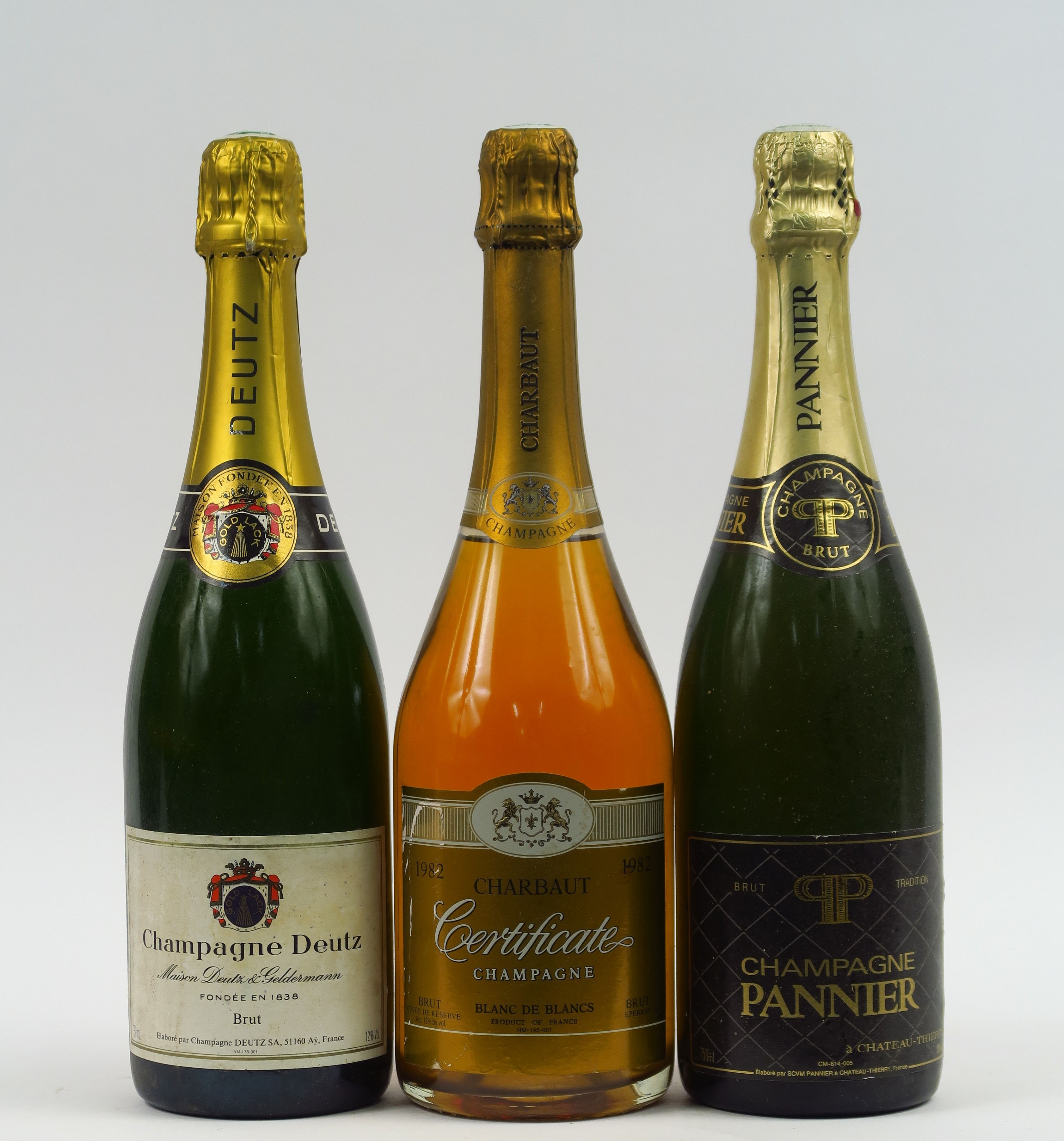 3 BOUTEILLES CHAMPAGNE : 1 DEUTZ 'GOLD LACK' - 1 CHARBAUT BLANC DE BLANCS 1982 0,5 CM SOUS LA COIFFE - 1 PANNIER