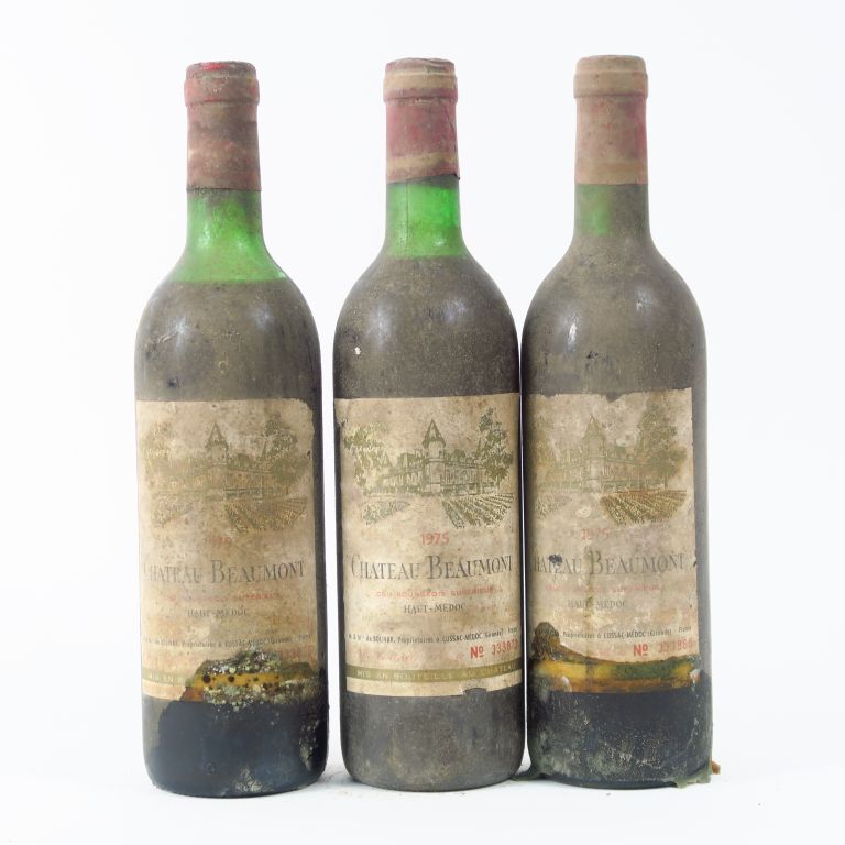 Lot de 3 BOUTEILLES CHÂTEAU BEAUMONT HAUT MEDOC - 1975 - 1 BG/1 LB/1 HEP au prix de 25 à 35 € en vente aux enchères par l'hôtel des ventes Primardeco