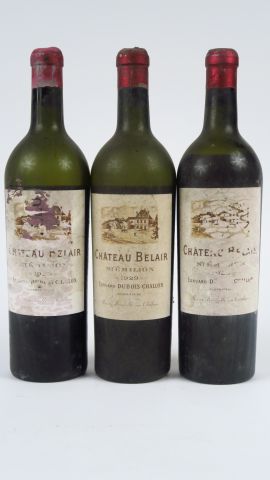 3 BOUTEILLES CHÂTEAU BELAIR 1er GCC ST EMILION - 1929 - 1 BEP/2 VIDANGES (NIVEAUX AU DESSUS DE L'ETIQUETTE)/EA/CAPS A