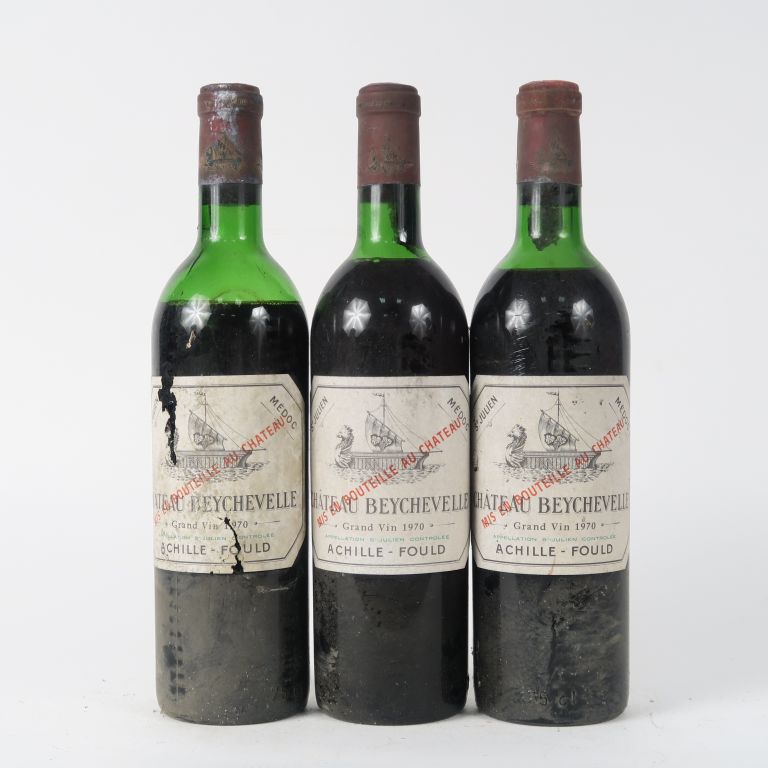 3 BOUTEILLES CHÂTEAU BEYCHEVELLE GCC ST JULIEN - 1970 - 1 HEP/1 MEP/1 BEP/1 EA/1 CAPS CORRODÉE