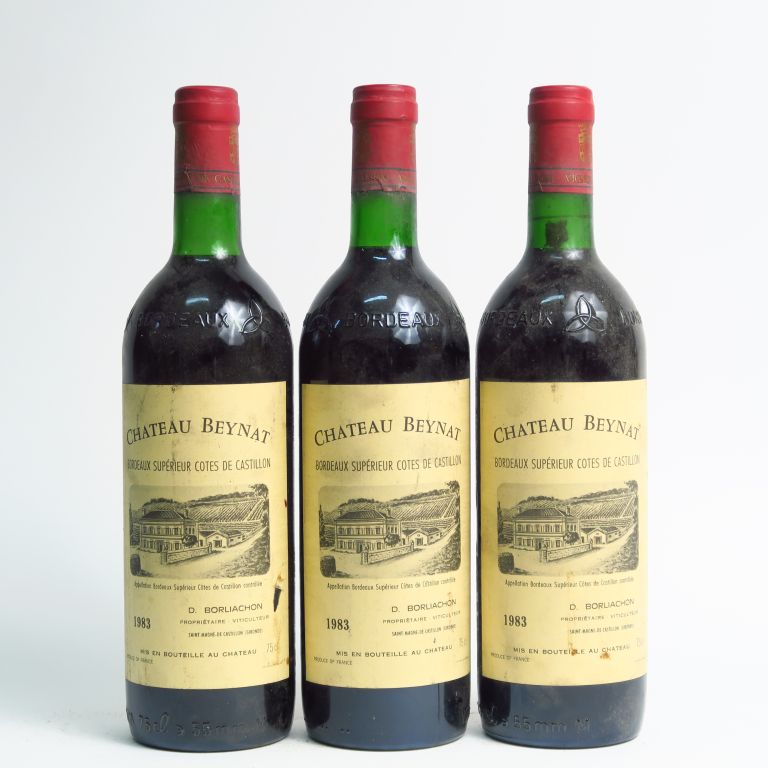 Lot de 3 BOUTEILLES CHÂTEAU BEYNAT CÔTES DE CASTILLON - 1983 - BG au prix de 20 à 30 € en vente aux enchères par l'hôtel des ventes Primardeco