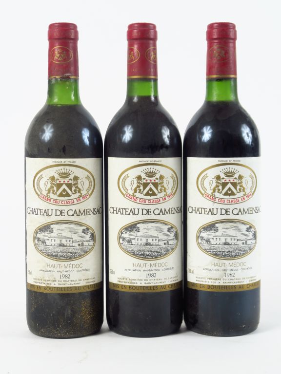 Lot de 3 BOUTEILLES CHÂTEAU CAMENSAC GCC HAUT MEDOC - 1982 - 2 BG/1 LB au prix de 30 à 40 € en vente aux enchères par l'hôtel des ventes Primardeco