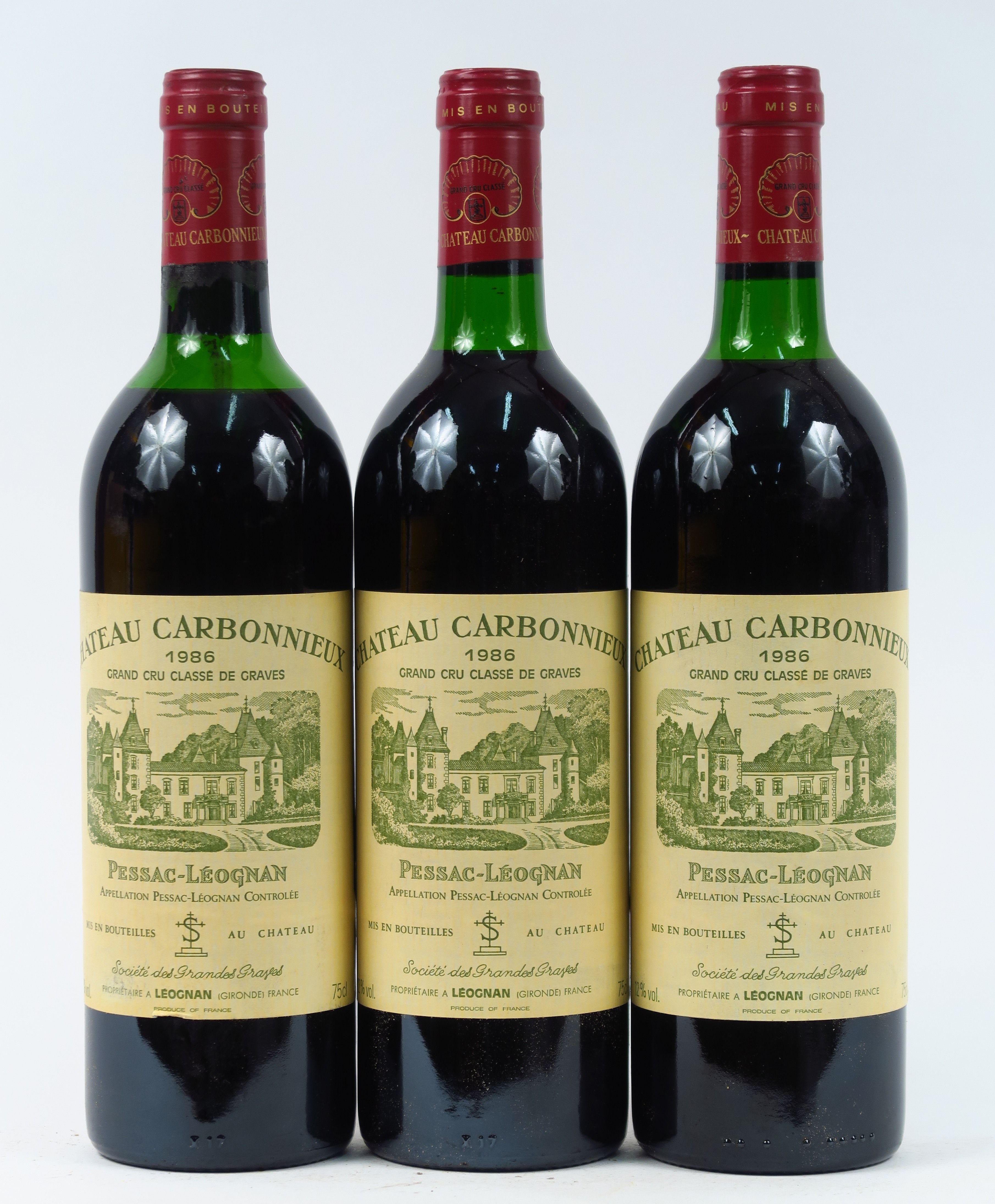 Lot de 3 BOUTEILLES CHÂTEAU CARBONNIEUX GCC GRAVES - 1986 - 2 BG/1 MEP au prix de 30 à 40 € en vente aux enchères par l'hôtel des ventes Primardeco