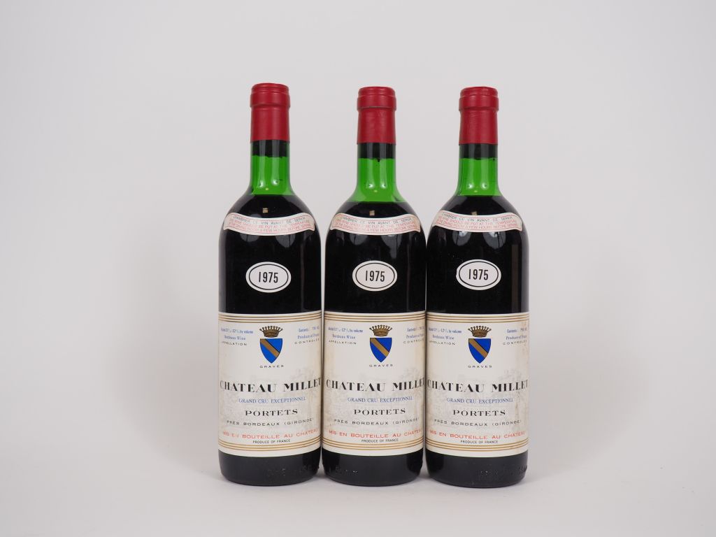 Lot de 3 BOUTEILLES CHÂTEAU MILLET GC PORTETS - 1975 - LB au prix de 35 à 45 € en vente aux enchères par l'hôtel des ventes Primardeco