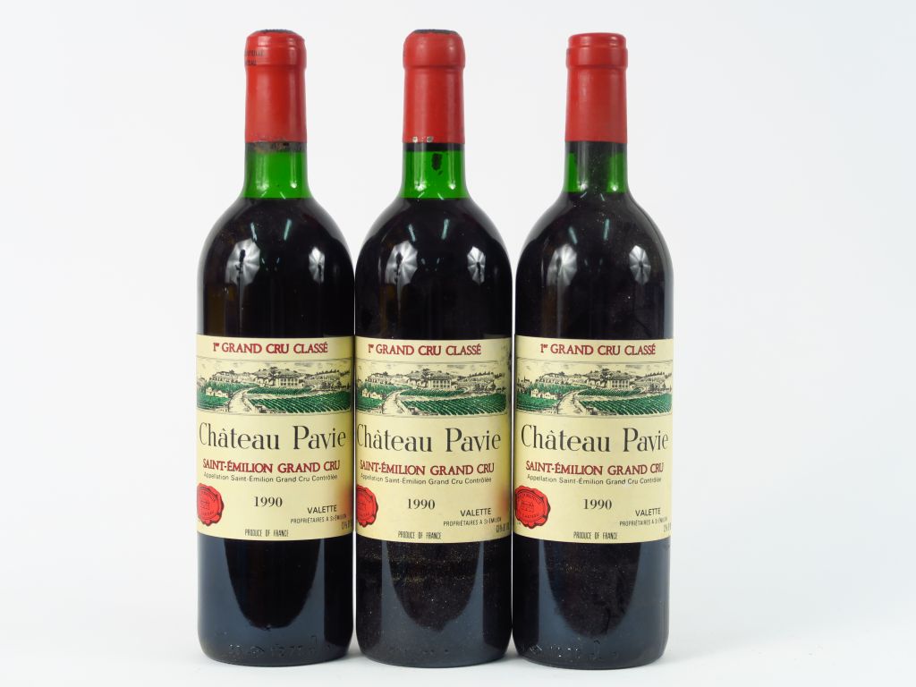 3 BOUTEILLES CHÂTEAU PAVIE 1er GCC ST EMILION - 1990 - 1 BG/ 2 LB/1 ETLA/2 CAPSULES LEGER POUSSES