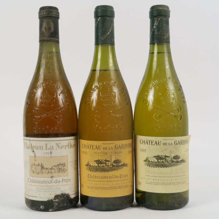 3 BOUTEILLES CHATEAUNEUF DU PAPE BLANC : 1 CHÂTEAU LA NERTHE 1993 ELA/BLS - 1 CHÂTEAU DE LA GARDINE 'VIEILLES VIGNES' 1993 4 CM - 1 CHÂTEAU DE LA GARDINE 1995