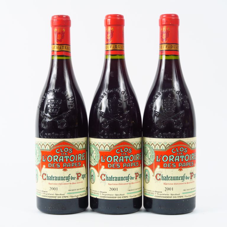 Lot de 3 BOUTEILLES CHATEAUNEUF DU PAPE CLOS DE L'ORATOIRE - 2001 au prix de 75 à 90 € en vente aux enchères par l'hôtel des ventes Primardeco