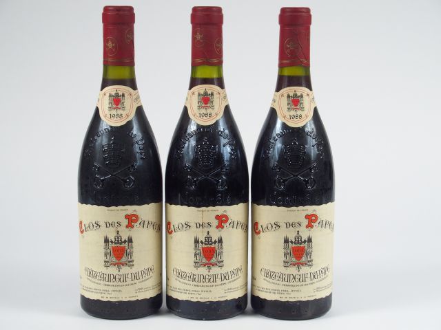Lot de 3 BOUTEILLES CHATEAUNEUF DU PAPE 'CLOS DES PAPES' P. AVRIL - 1988 au prix de 160 à 180 € en vente aux enchères par l'hôtel des ventes Primardeco