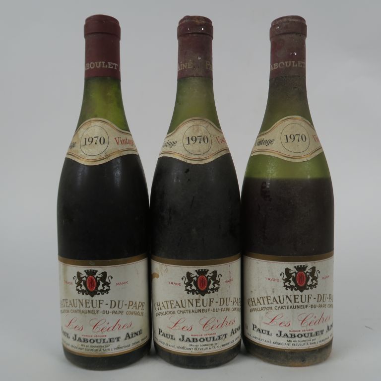 3 BOUTEILLES CHÂTEAUNEUF DU PAPE 'LES CEDRES' PAUL JABOULET AINE - 1970 - 4 CM/5,5 CM/9 CM/BS