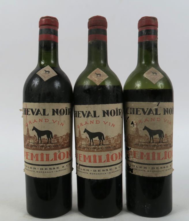 Lot de 3 BOUTEILLES CHEVAL NOIR SAINT EMILION - 1952 - 1 LB/2 BEP/ELA au prix de 15 à 20 € en vente aux enchères par l'hôtel des ventes Primardeco