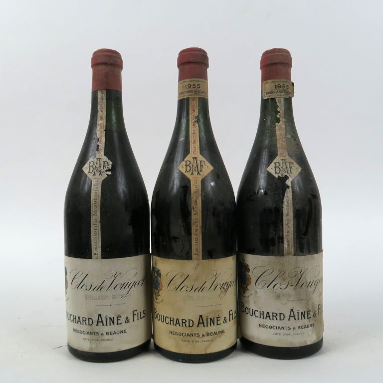 3 BOUTEILLES CLOS DE VOUGEOT BOUCHARD AINE FILS - 1955 - 1 PRESUMEE - 2,2 CM/3,5 CM/4,5 CM/ES/ET/ETLA/BS