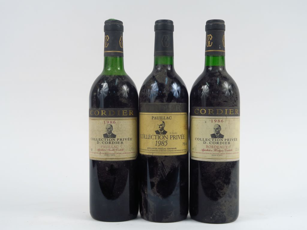 3 BOUTEILLES CORDIER : 2 PAUILLAC 'COLLECTION PRIVEE' 1985 BG + 1986 HEP - 1 BORDEAUX 'COLLECTION PRIVEE' 1986 BG