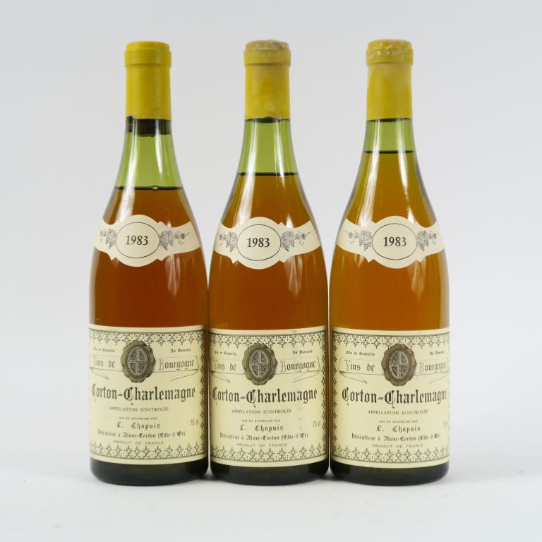 3 BOUTEILLES CORTON CHARLEMAGNE GC DOMAINE LOUIS CHAPUIS - 1983 - 3,5 CM/4 CM/2 CAPS LEGER CORRODÉE