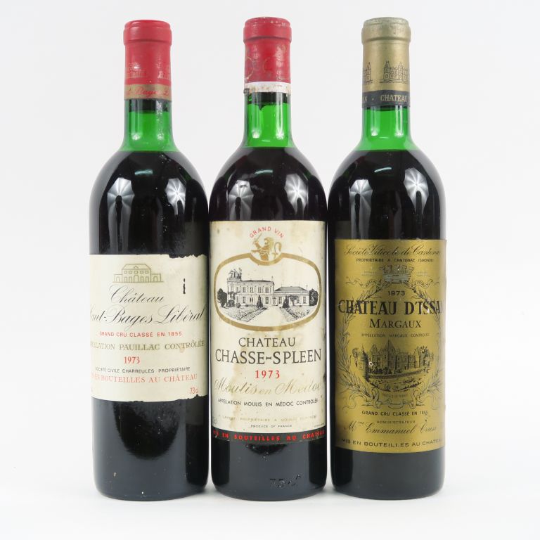 3 BOUTEILLES DE 1973 : 1 CHÂTEAU D'ISSAN MARGAUX HEP - 1 CHÂTEAU HAUT BAGES LIBÉRAL GCC PAUILLAC LB - 1 CHÂTEAU CHASSE SPLEEN MOULIS LB