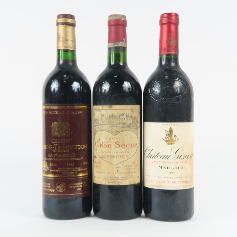 3 BOUTEILLES de 1995 : 1 CHÂTEAU GISCOURS GCC MARGAUX - 1 CHÂTEAU CALON SEGUR GCC ST ESTEPHE BG/ELA - 1 CHÂTEAU LAROSE TRINTAUDON CB HAUT MEDOC