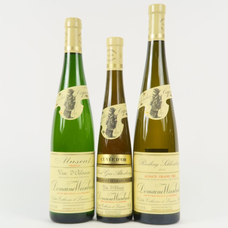 3 BOUTEILLES DOMAINE WEINBACH 'CLOS DES CAPUCINS' : 1 RIESLING SCHLOSSBERG 2011 - 1 MUSCAT RÉSERVE 2011 - 1 PINOT GRIS (50 CL) ALTENBOURG QUINTESSENCE DE GRAINS NOBLES 'CUVÉE NOBLE' 2010