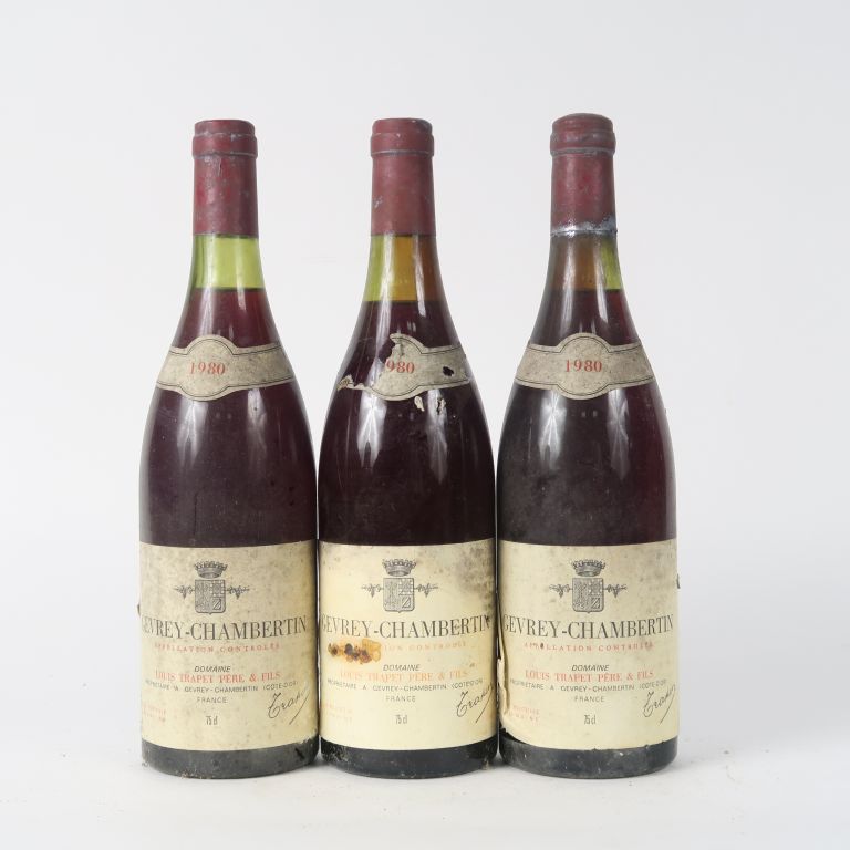 Lot de 3 BOUTEILLES GEVREY CHAMBERTIN LOUIS TRAPET - 1980 - 2 à 2.5 CM/1 à 3 au prix de 100 à 120 € en vente aux enchères par l'hôtel des ventes Primardeco