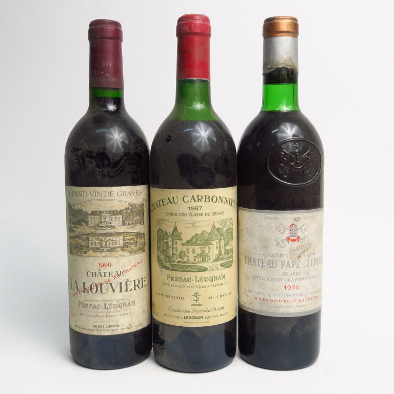 3 BOUTEILLES GRAVES : 1 CHÂTEAU PAPE CLEMENT GCC 1976 LB/ELA - 1 CHÂTEAU CARBONNIEUX GCC 1987 HEP-MEP/CAPS CORRODEE - 1 CHÂTEAU LA LOUVIERE 1990