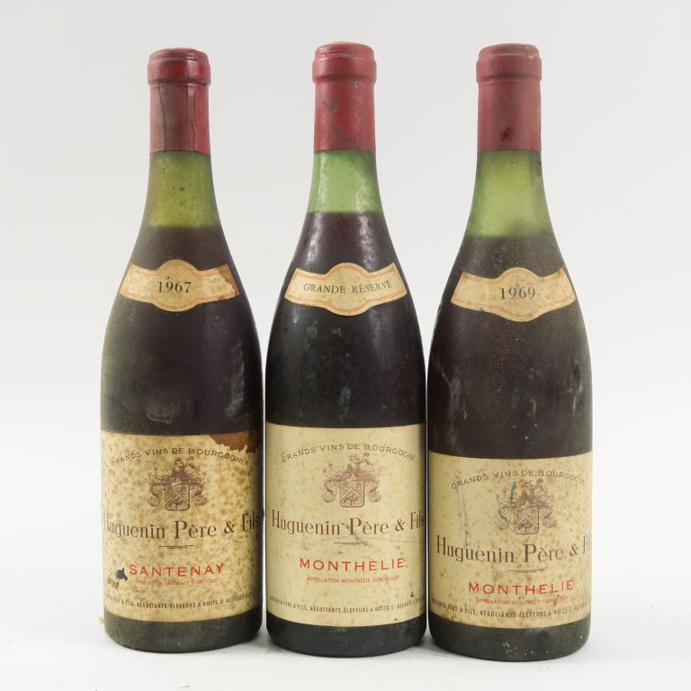3 BOUTEILLES HUGUENIN PÈRE FILS : 1 SANTENAY 1967 3.5 CM - 1 MONTHÉLIE 1969 4 CM - 1 MONTHÉLIE 'GRANDE RÉSERVE' 3 CM