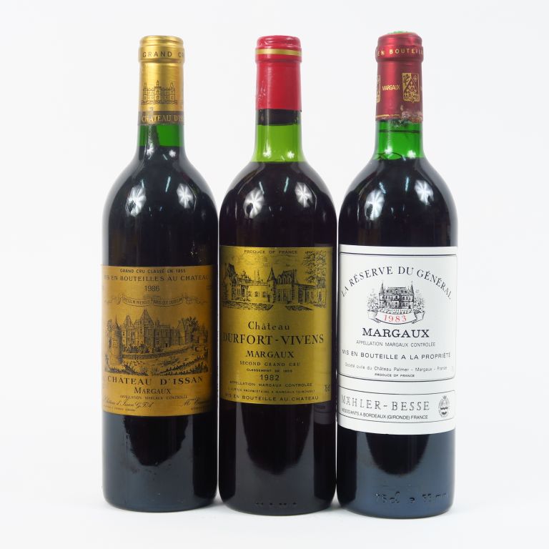 3 BOUTEILLES MARGAUX : 1 CHÂTEAU DUFORT VIVENS GCC 1982 HEP - 1 CHÂTEAU D'ISSAN GCC 1986 - 1 LA RESERVE DU GENERAL 1983 LB