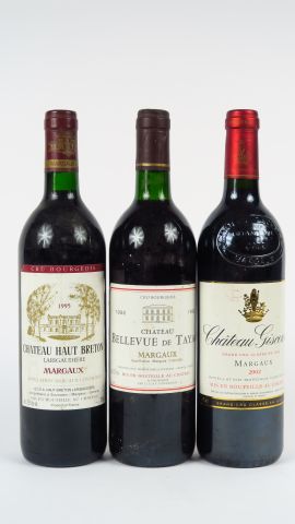 3 BOUTEILLES MARGAUX : 1 CHÂTEAU GISCOURS GCC 2002 - 1 CHÂTEAU BELLEVUE DE TAYAC 1992 - 1 CHÂTEAU HAUT BRETON 1995