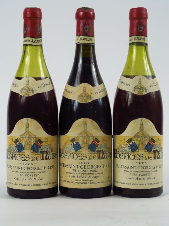 3 BOUTEILLES NUITS ST GEORGES 1er CRU HOSPICES DE BEAUNE : 2 'CUVEE ANTIDE NIDAN' 1975 6 CM - 1 'CUVEE RICHARD DE BLIGNY' 1987 2 CM