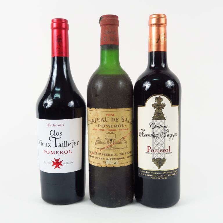 3 BOUTEILLES POMEROL : 1 CHÂTEAU DE SALES 1974 MEP - 1 CLOS VIEUX TAILLEFER 2011 - 1 HERMITAGE MAZEYRES 2015